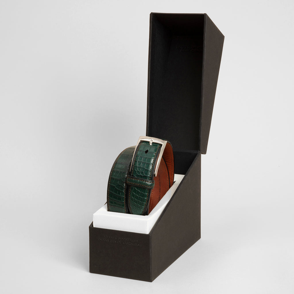 Solid Sterling Silver buckle made in Germany with genuine alligator skin from the US with small scales for the perfect look and feel. Each skin is closely numbered and follow CITES regulations, who adhere to the conditions of the Washington Convention on International Trade in Endangered Species of wild fauna and flora.