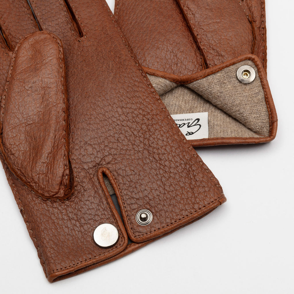A glove, made purely by hand from South American peccary leather. The skin has a beautifully textured grain, typical of this leather. All seams are stitched by hand and the glove is lined with cashmere.