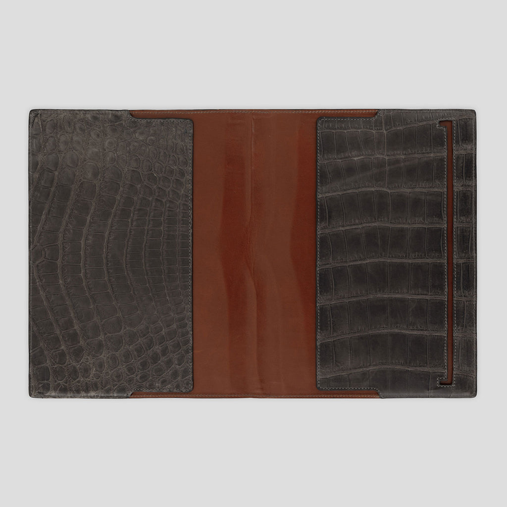 The exterior piece is thick and supple Crocodile hide, the inside is vegetable tanned bull calf leather. Each cover is made by hand, cut, assembled, stitched, and finished with care, and it feels simply incredible in your hands. Buy it once and refill it with a new notebook whenever you run out of pages.