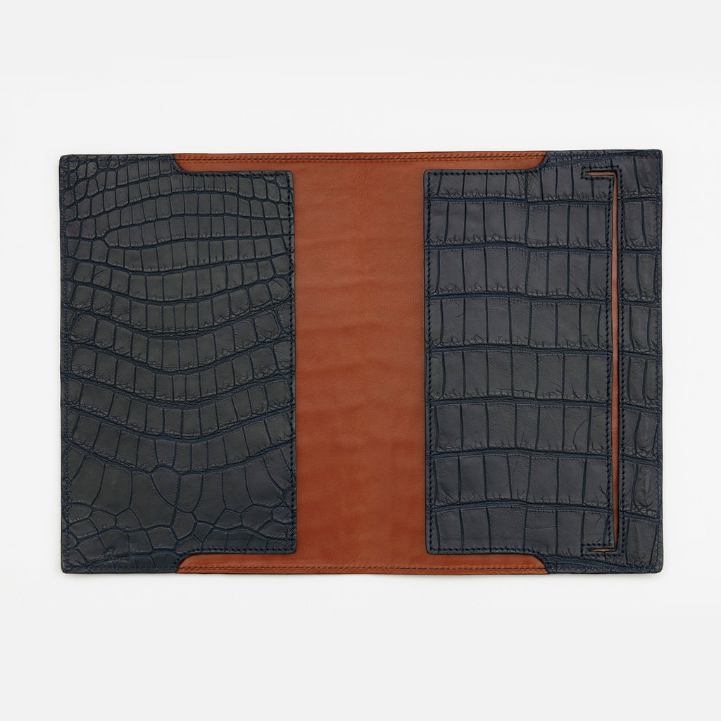 The exterior piece is thick and supple Crocodile hide, the inside is vegetable tanned bull calf leather. Each cover is made by hand, cut, assembled, stitched, and finished with care, and it feels simply incredible in your hands. Buy it once and refill it with a new notebook whenever you run out of pages.