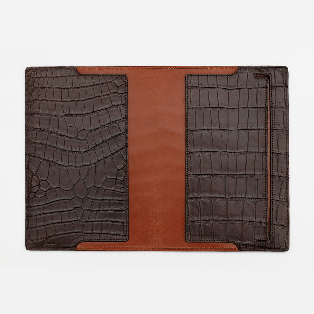The exterior piece is thick and supple Crocodile hide, the inside is vegetable tanned bull calf leather. Each cover is made by hand, cut, assembled, stitched, and finished with care, and it feels simply incredible in your hands. Buy it once and refill it with a new notebook whenever you run out of pages.