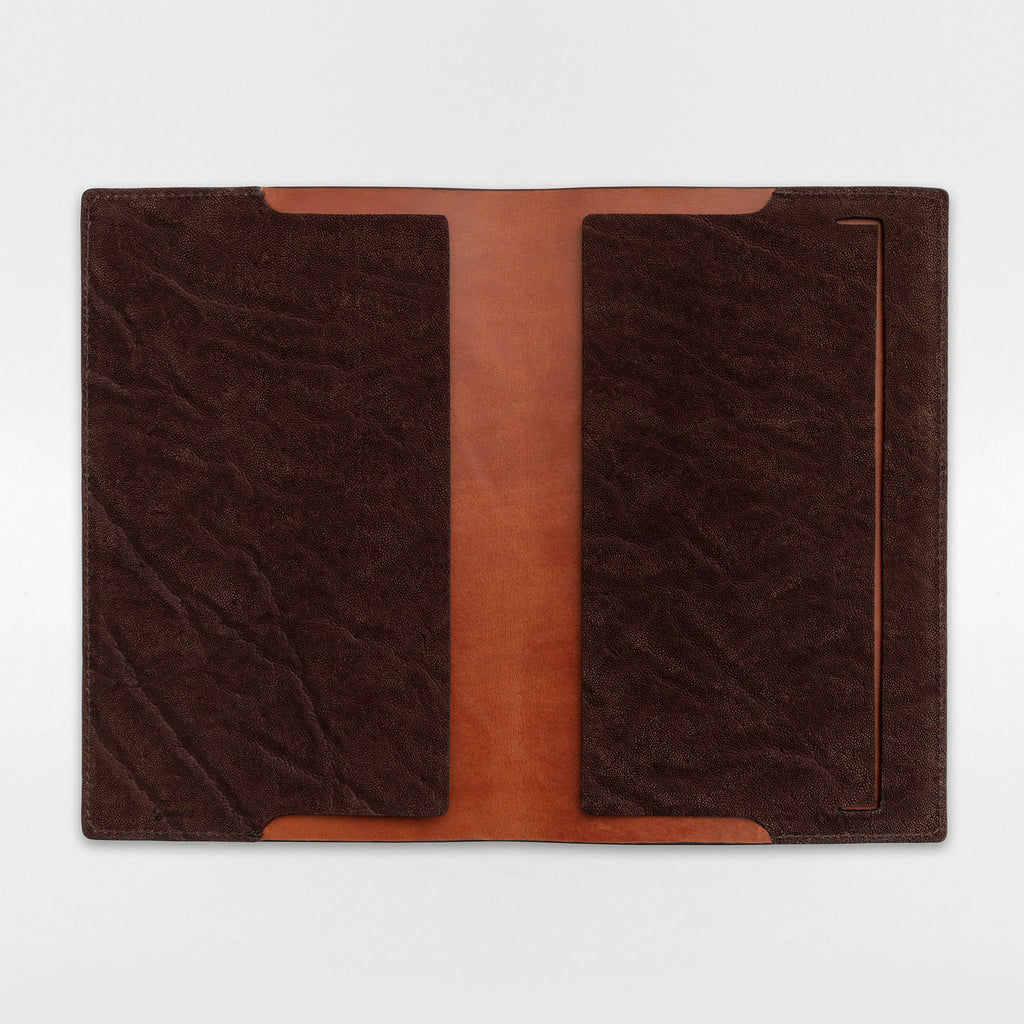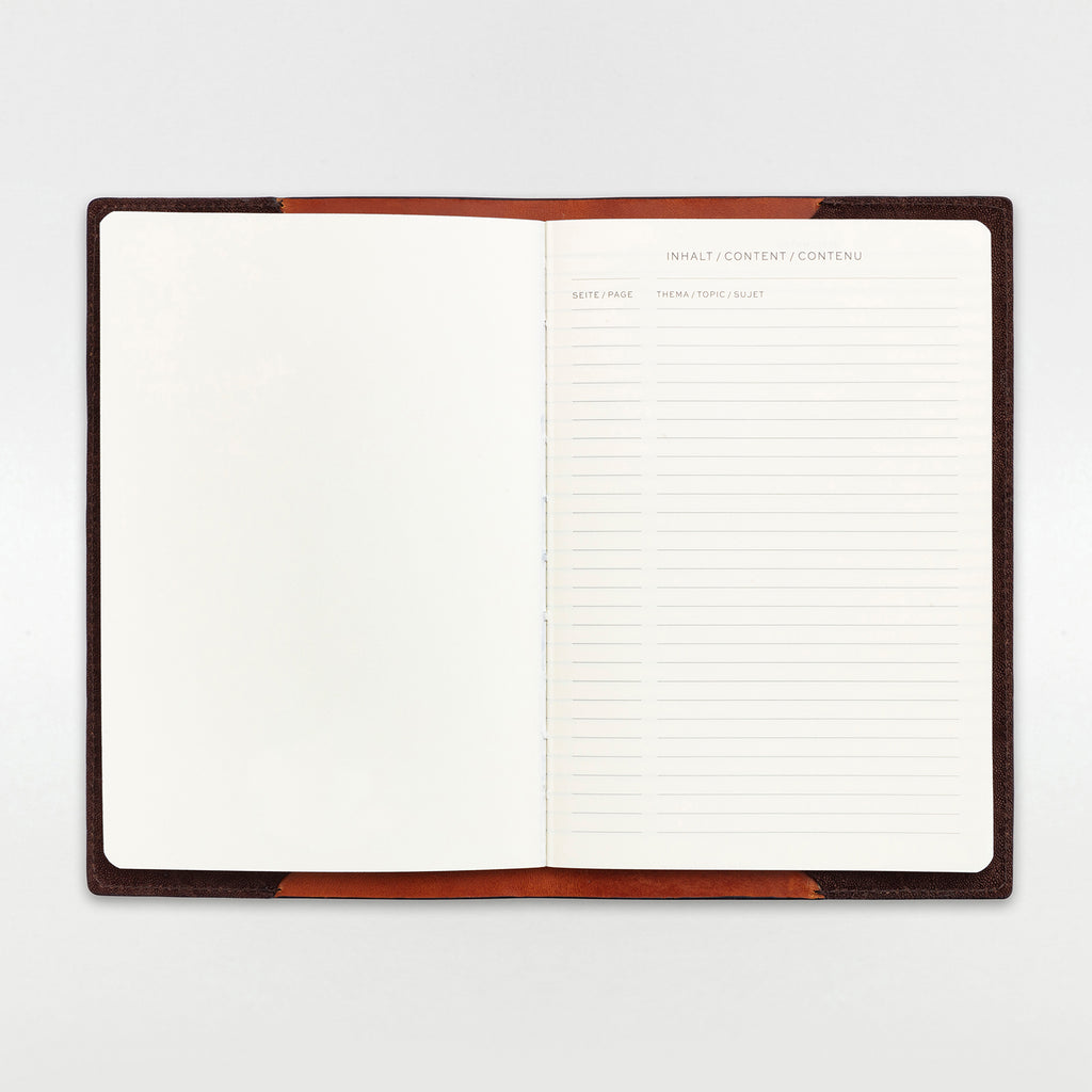 The exterior piece is thick and supple Elephant leather, the inside is vegetable tanned bull calf leather. Each cover is made by hand cut, assembled, stitched, and finished with care, and it feels simply incredible in your hands. Buy it once and refill it with a new notebook whenever you run out of pages.
