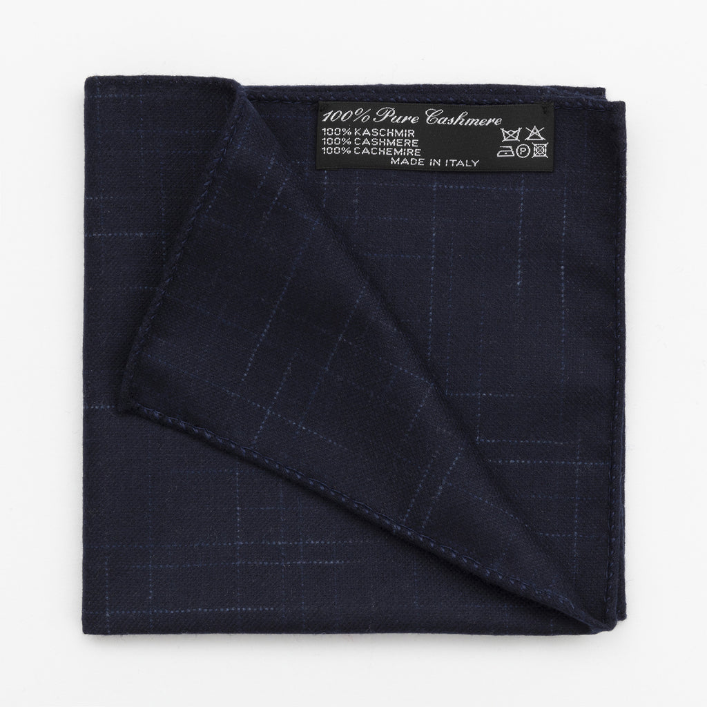 And elegant and refined accessory, the pocket square in 100% Cashmere in blue window check. Handmade in Italy from the world know fabric weaver Drapers Italy.