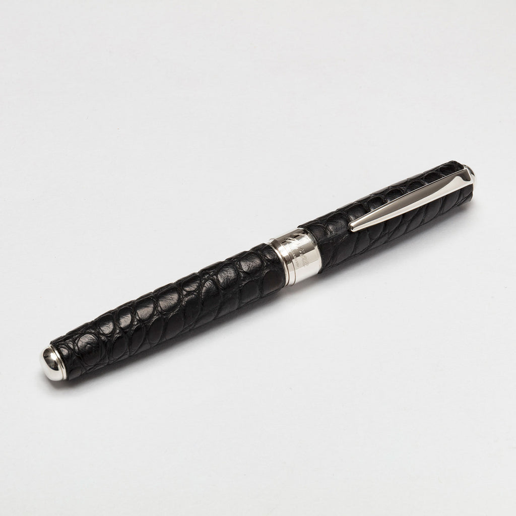 This Fountain Pen is hand-crafted and coated with genuine alligator leather by Italian artisans. The writing section made of Solid Sterling Silver is engraved with geometric design and hallmarked 925.
