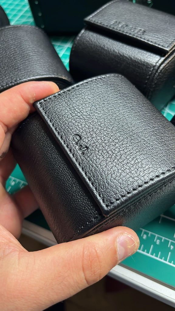 Single Watch and Jewelry Roll. This roll is made of vegetable tanned Goat leather also known as "Chérvo" with a removable nubuck covered cylinder for watches or bracelets. The design is completed with a nickel-free snap closure.