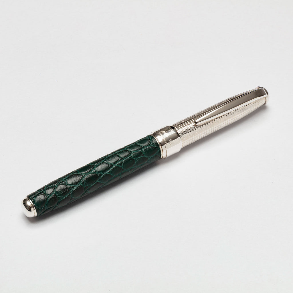 The Fountain Pen body is hand-made of Alligator hide while the pen cap and grip are constructed of solid sterling silver and engraved with a geometrical guilloche design. The pen is hallmarked *AO 28 – 925. These stamps insure each customer that we are using sterling silver.